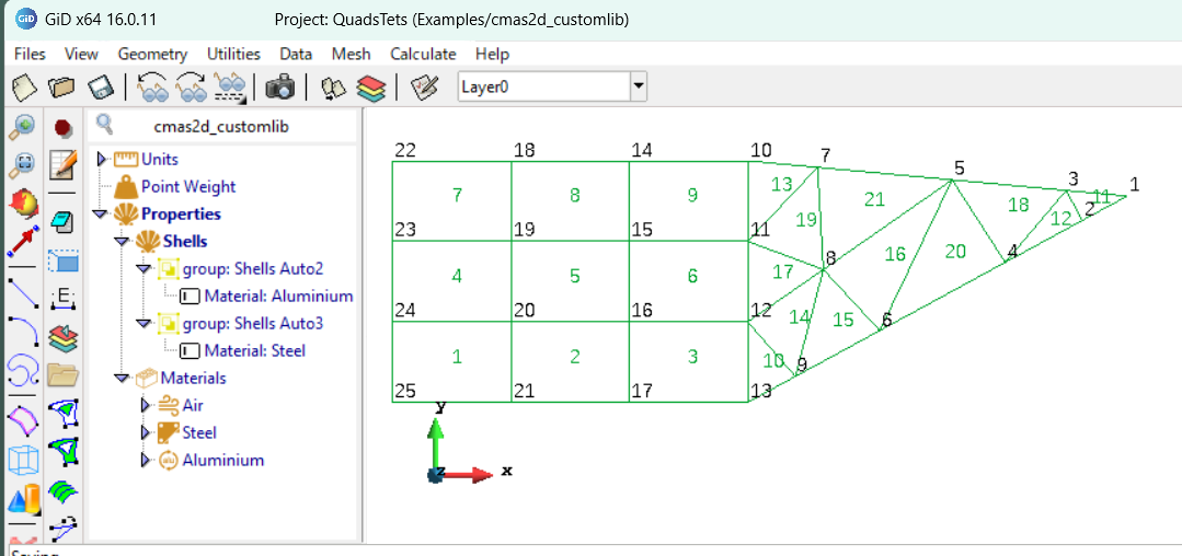 The demo problemtype âExamples/cmas2d_customlibâ is only prepared to calculate with triangles, then the problemtype is restricting the creation of groups of elements of other types (with the optional parameter: ov_element_types=âtriangleâ)