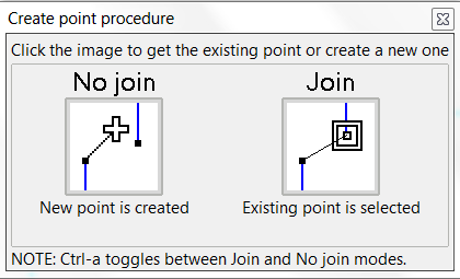 The idea is to join the last line to the first (already existing or old) point. THe shape is constructed correctly and I believe no new point is created which is good. However the “Create point Procedure dialog box” (see attachment) still appears. The command window shows: