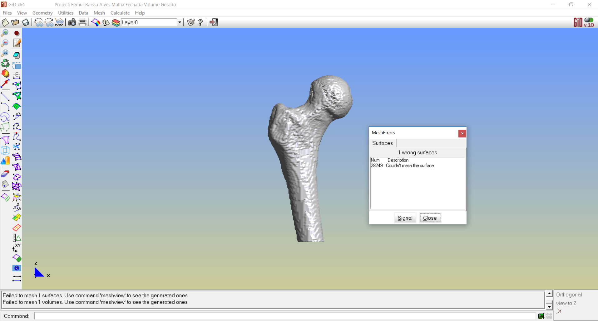 I extracted a thigh bone geometry with Invesalius software. In Rhino 6, I’ve fixed the STL file incompatibilities errors, thus, generating a closed mesh of the thigh bone geometry. I saved the mesh as a STL file and imported it with the GiD 13 (in the lab I work there are other GiD versions available), then I used the command “Geometry >> Create >> Geometry from mesh >> one element-one surface” to generate the geometries I needed, the volume was created using the “Geometry >> Create >> Volume >> By contour” command.