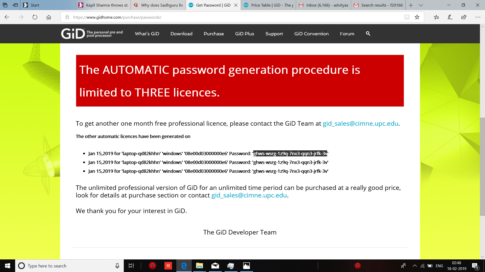 I am a student from INDIA currently studying at BITS Pilani engineering college.I had installed GID one month (15th JAN 2019) ago to work on an opensees class project . This month after the free trial expired ,I went to your site so as to generate a new password since I believe it can be renewed 2 times, but after entering the details it showed me that I have already used up the 3 chances. I had only installed the software the previous month. Moreover it is showing that I have generated 3 passwords on the same date.(attached the screenshot).I would request you to provide me the password for the remaining two months since I have got an important project presentation next month and I am in great distress.