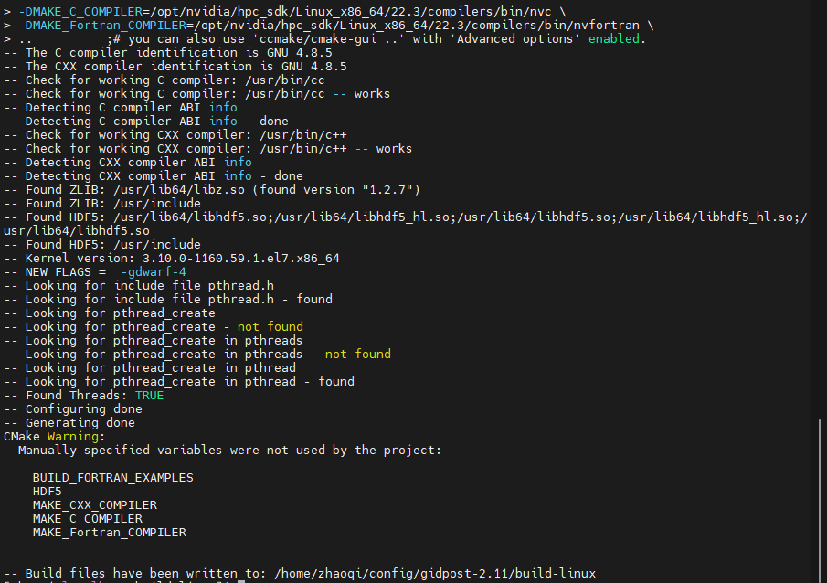 Following the reference “https://gidsimulation.atlassian.net/wiki/spaces/GPT/pages/2500165811/Compiling+the+library+and+examples”, I add the thrid part libraries into my CentOS linux and the environement variables. Acoording to the commands in the “How to build(Linux-nvidia hpc sdk)”, I need to download the file “gidpost-2.11” drived from “https://downloads.gidsimulation.com/#Tools/gidpost/” and modify the name as “gidpost”. After changing the current work direction as “../gidpost” via the command “cd”, the file “build-linux” need to be conducted by the command “mkdir”. When I run the command “cmake -DHDF5=ON …”, I obtain the warning such as “Lookig for pthread_creat - not found”. I don’t know whether they are reasonable in this step.