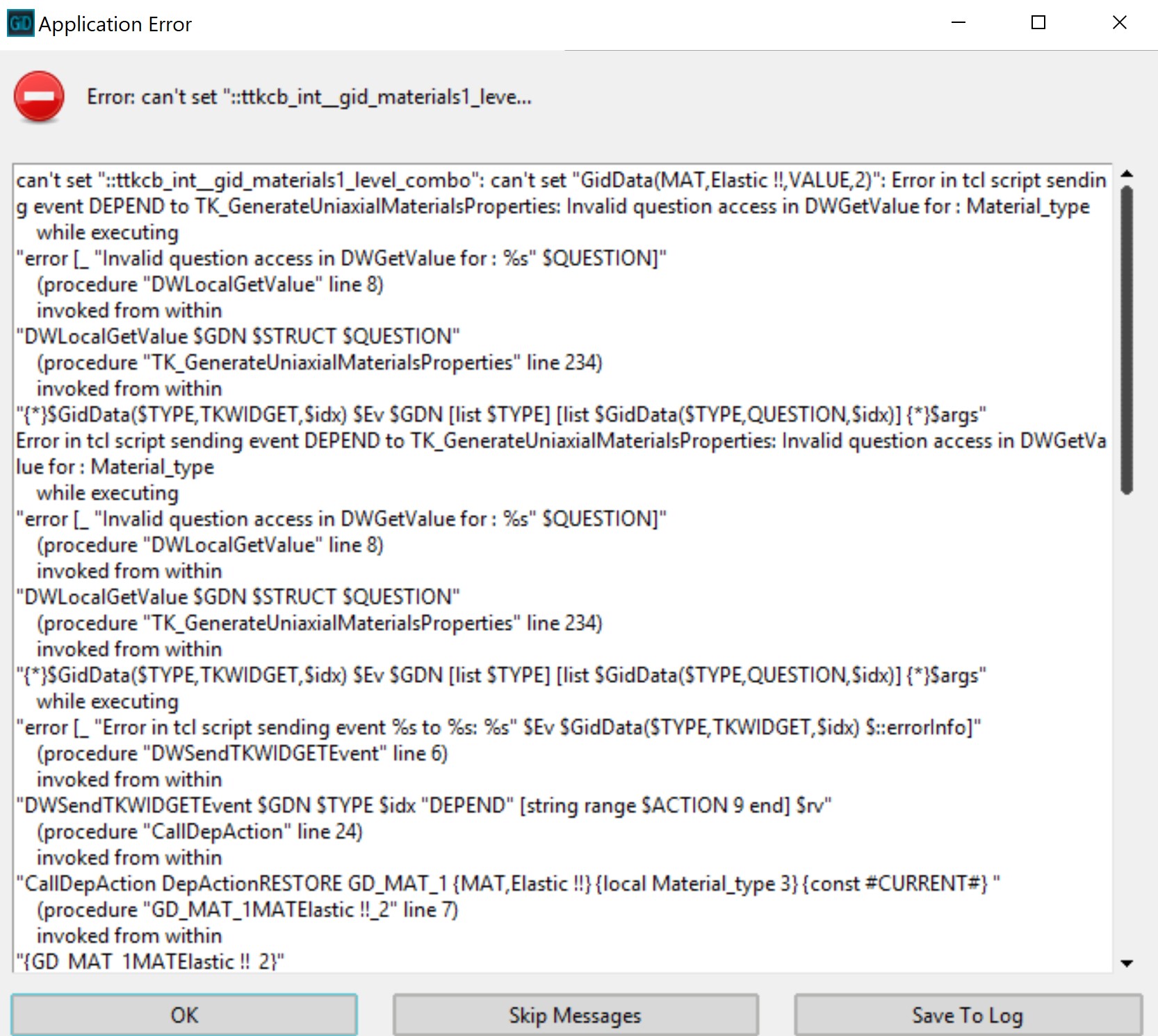 I refer to OpenSees problemtype for some materials, such as Elastic, Elastic Perfectly plastic and more. This error is occured when i make a copy of the template material with a name which contains spaces (e.g. “Elastic E=30GPa” : copy of “Elastic”). This happens in every material that use a tkwidget and inside the SYNC event is used the tkwidget TK_DWSet for changing field value and state too.
