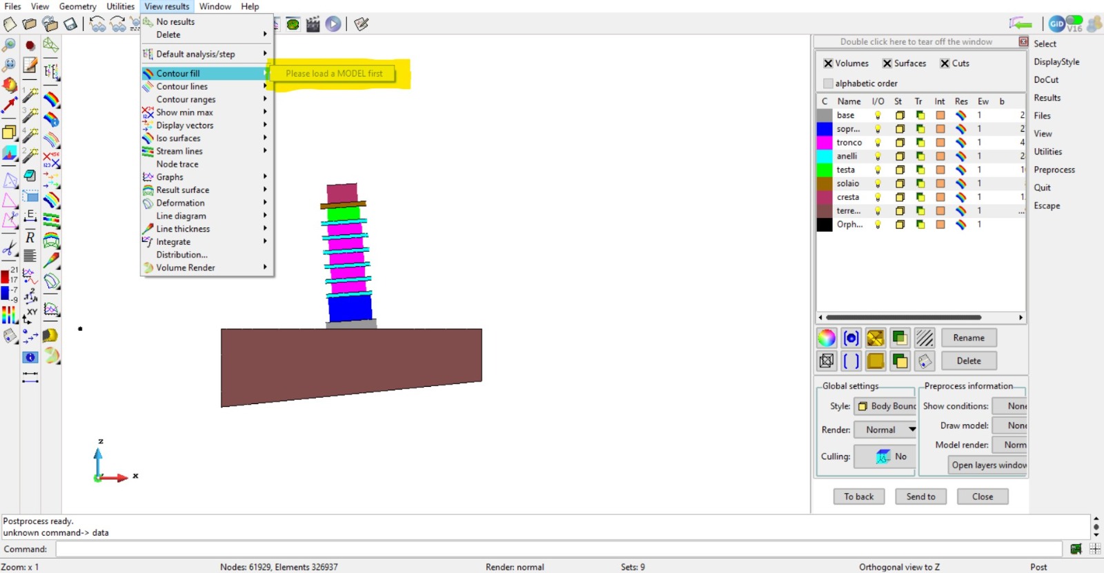 I am writing because I cannot start the postprocessing of my model and I don’t understand why. The problem is the following: when all the modeling is finished, after assigning the material, creating the mesh, and calculating, I go to post processing and I’m not able to see any results because the program says “Please load a MODEL first” and all the options are frozen. I don’t understand why, as I’m pretty sure mine is a model ![]()