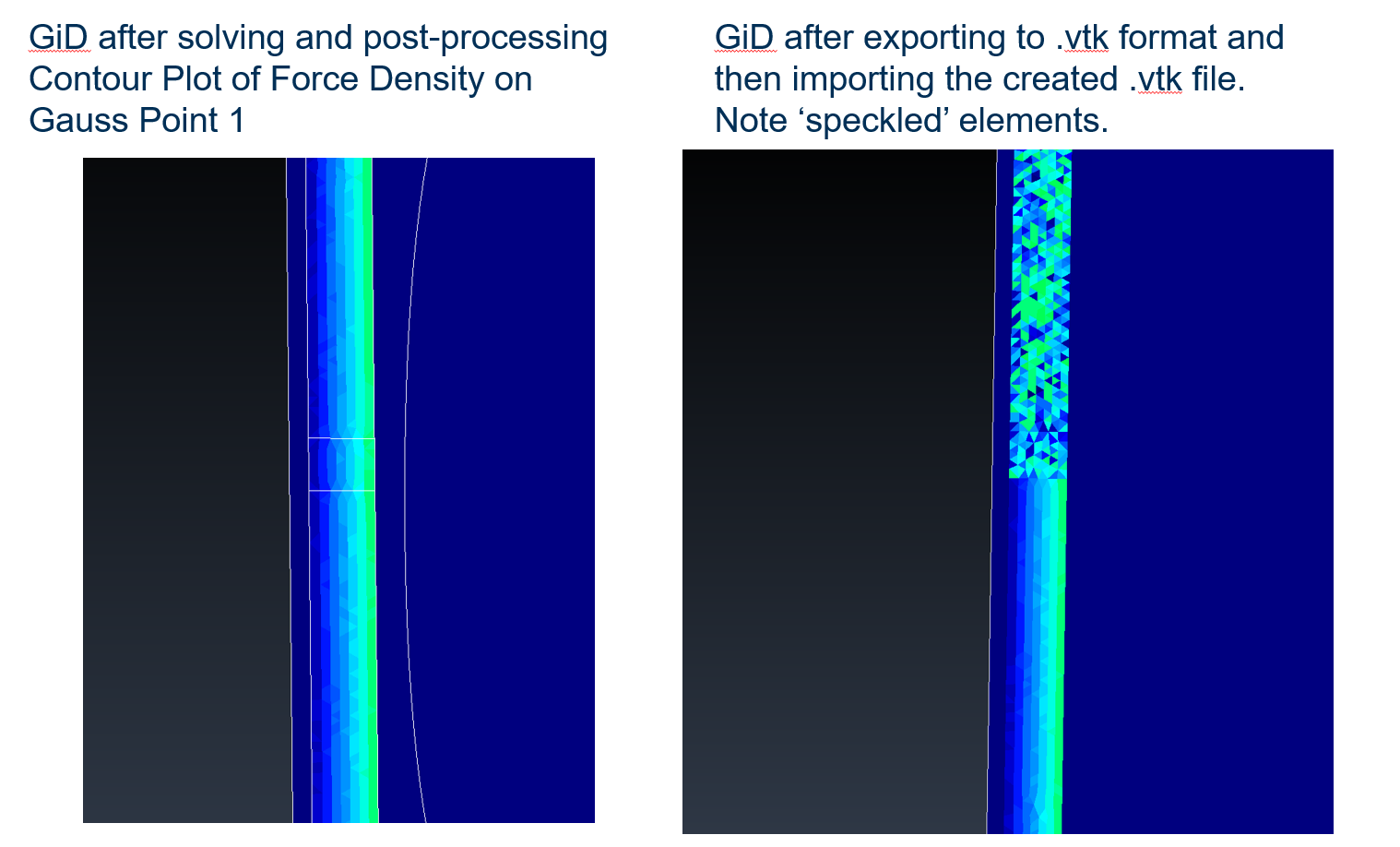 I’m having some difficulty exporting results from GiD’s postprocessing environment. I’m trying to export results in .VTK format so I can view them in Paraview. The export seems to run fine, but then when I open the .vtk file in paraview, part of the results file appears to be corrupted; elements in only part of the model show a ‘speckled’ pattern as shown in the right hand image below. If I import the .vtk file back into GiD I get the same issue, so it’s not related to Paraview.